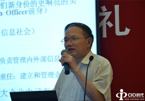 北京大学信息管理系博士生导师赖茂生教授为大家带来题为《CIO的职责、素质与培训》的主题报告。他通过国内外大量的调查数据来说明了 CIO的地位正在逐步提升,深入的分析让各位学员对CIO的角色地位、主要职责有了更清楚的认识。随后,他还着重分析了影响CIO成功的个人能力排序、理 想知识结构等观点,他认为:CIO提高自己的综合素质是特别重要的一个环节。